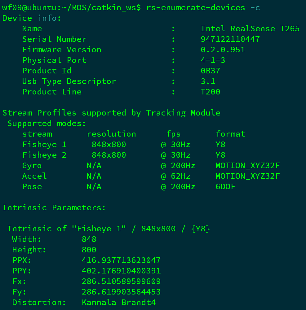 T265在出厂前就对相机进行了标定,每个相机内部都带有相机的内参和外参,终端输入以下命令,即可读取T265的配置信息