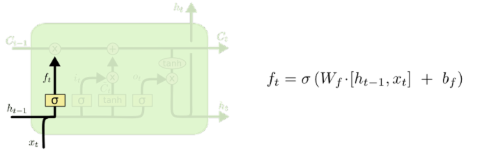 LSTM中第一步是决定会从细胞状态中丢弃什么信息。这个决定通过一个称为 忘记门层 的门来完成。该门会读取 \(h_{t-1}\) 和 \(x_{t}\) ,输出一个在 0 到 1 之间的数值给每个在细胞状态中的数字。1 表示"完全保留",0 代表"完全舍弃"。