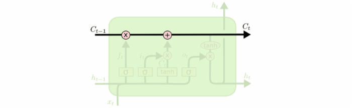 LSTM的关键就是细胞状态(cell),水平线在图上方贯穿运行,细胞状态类似于传送带,直接在整个链上运行,只有一些少量的线性交互,信息在上面流传保持不变会很容易。