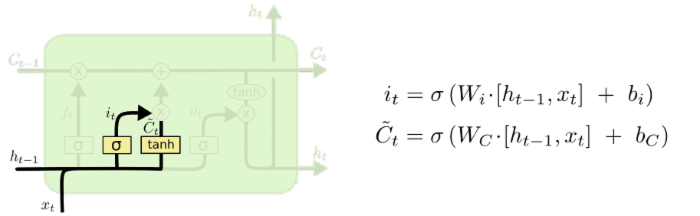 下一步是确定什么样的新信息被存放在细胞状态中。这里包含两部分。第一,sigmoid 层称 "输入门层" 决定什么值我们将要更新。然后,一个 tanh 层创建一个一个新的候选值向量,\(\),会被加入到状态中。下一步,我们会将这两个信息来产生对状态的更新。