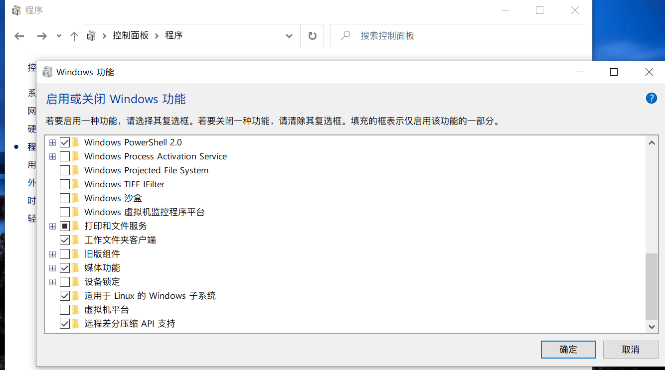 打开控制面板-程序,选择适用于Linux的Windows子系统。