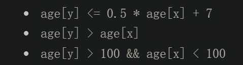 用户y需要满足: \[ 0.5 \times ages[x]+7 < ages[y] \leq age[x] \] 当\(age[x] \leq 14\)时,不存在满足要求的ages[y],因此我们只需要考虑\(ages[y] \geq 15\)的情况,此时满足要求的\(ages[y]\)的范围:\((0.5 \times ages[x]+7, age[x]]\)。