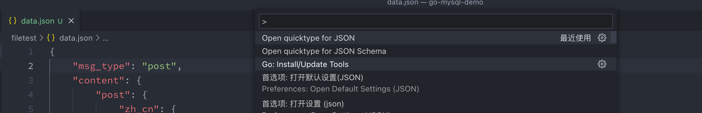 打开VScode command,Mac上的快捷键是 Command + Shift + P,选择Open quicktype for JSON,如果语言不对的话可以使用Set quicktype target language指定生成代码的语言