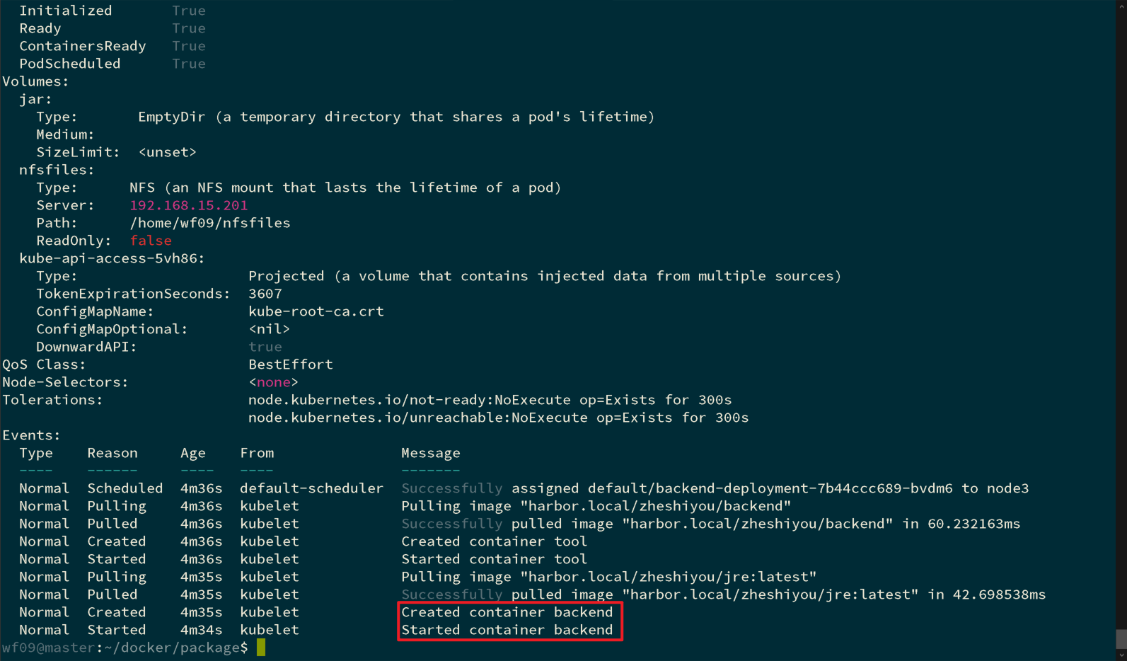上面的示例定义在资源配置文件deployment.yaml中,其中的Pod资源拥有一个关联至NFS服务器192.168.15.201的存储卷,backend容器将其挂载到容器中的/share目录上,它是backend容器中的需要持久化的目录。