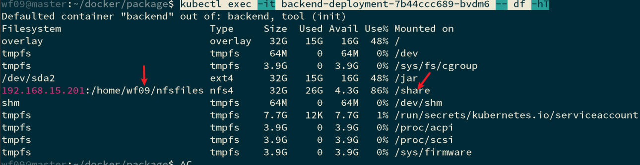 1 | kubectl exec -it backend-deployment-7b44ccc689-bvdm6 -- df -hT |