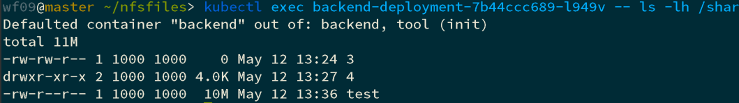kubectl exec backend-deployment-7b44ccc689-l949v -- ls -lh /share