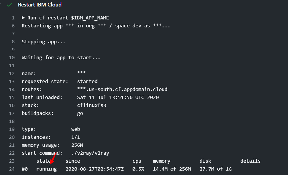 - name: Init run: | wget -q -O - https://packages.cloudfoundry.org/debian/cli.cloudfoundry.org.key | sudo apt-key add - echo "deb https://packages.cloudfoundry.org/debian stable main" | sudo tee /etc/apt/sources.list.d/cloudfoundry-cli.list sudo apt-get update sudo apt-get install cf-cli - name: Login IBM Cloud env: IBM_ACCOUNT: ${{ secrets.IBM_ACCOUNT }} IBM_PASSWORD: ${{ secrets.IBM_PASSWORD }} run: | cf login -a https://api.us-south.cf.cloud.ibm.com -u $IBM_ACCOUNT << EOF $IBM_PASSWORD EOF - name: Get IBM Cloud Apps run: | cf a - name: Restart IBM Cloud env: IBM_APP_NAME: ${{ secrets.IBM_APP_NAME }} run: | cf restart $IBM_APP_NAME