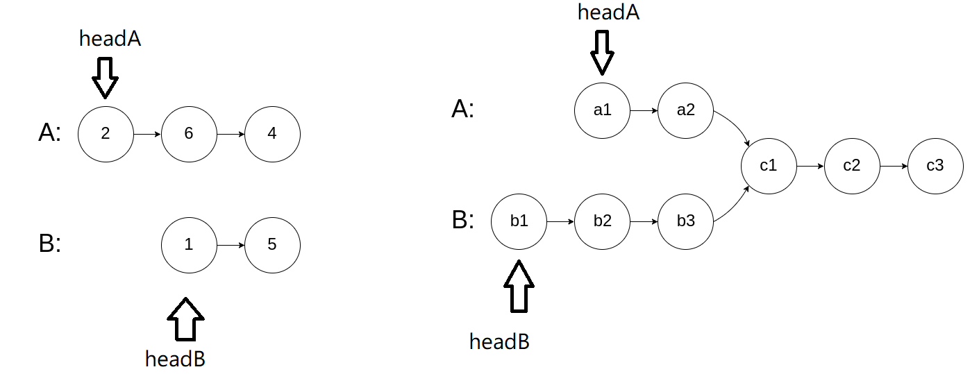 两个cur结点分别指向headA和headB,然后依次向后迭代,当迭代到最后一个结点时,切换到另一个分支。若有交点,迭代a + c + b次后会迭代到交集所在的节点;若无交点,迭代a + b次后会迭代到NULL节点,此时return headA和headB任意节点皆可。