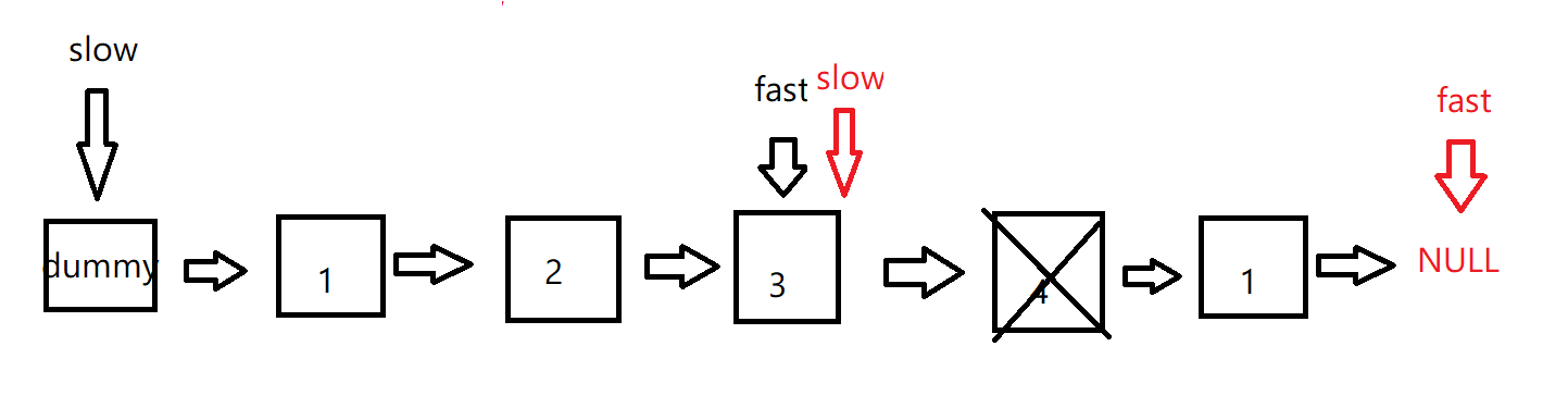 1 | // fast先移动n+1步,然后让fast和slow同时移动 |