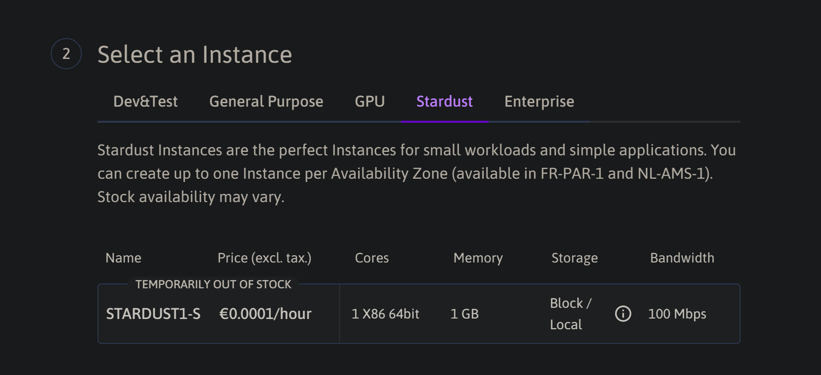 Stardust是法国云服务器厂商Scaleway下的一款的经济实例。官方介绍是这样的——“A tiny Instance so powerful and cost effective that we only release it once a month.”