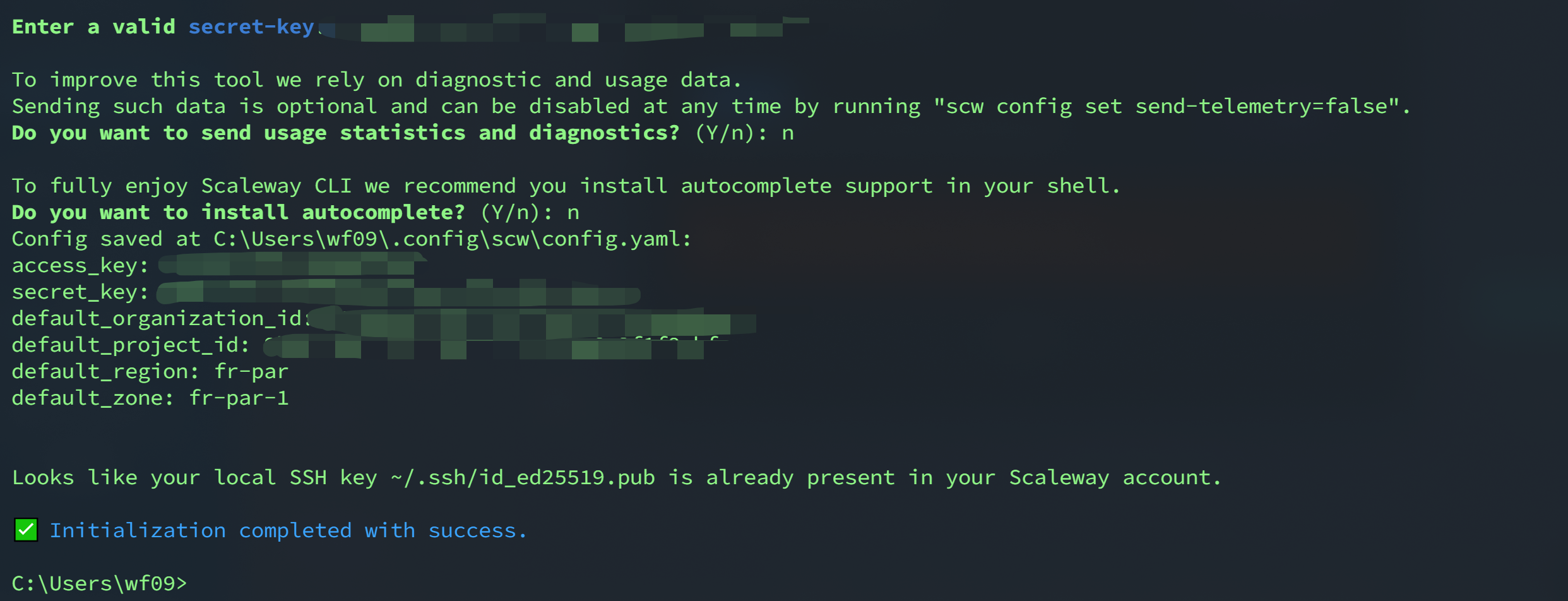 在cmd或者shell控制台输入scw init,根据提示输入上文记录的Secret