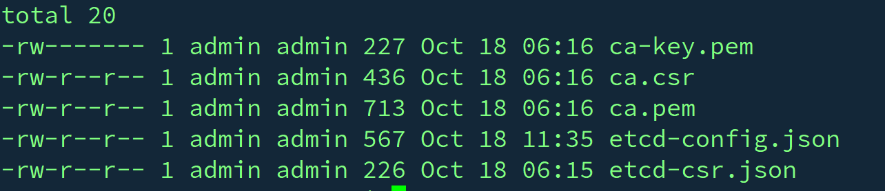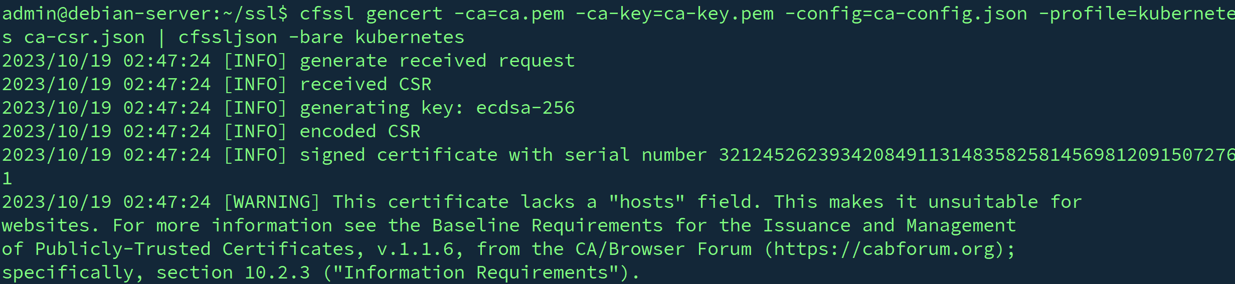 - hosts 中的内容可以为空,即使按照上面的配置,向集群中增加新节点后也不需要重新生成证书。 执行下面命令, 生成 kubernetes.csr, kubernetes-key.pem, kubernetes.pem 文件
